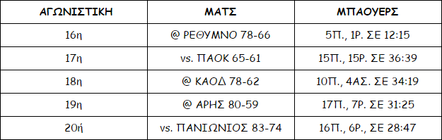 Κόντρα στον Πανιώνιο ο Τιμ Μπάουερς μέτρησε 16 πόντους (6/7 δίποντα) και 6 ριμπάουντ σε περίπου 29 λεπτά συμμετοχής. Η εμφάνιση αυτή ήταν απλά η συνέχεια των πολύ θετικών εμφανίσεων που πραγματοποιεί ο Αμερικανός γκαρντ (ύψος 1.88μ.), ο οποίος προσφέρει πολλά στον Κόροιβο. Αναλυτικά: