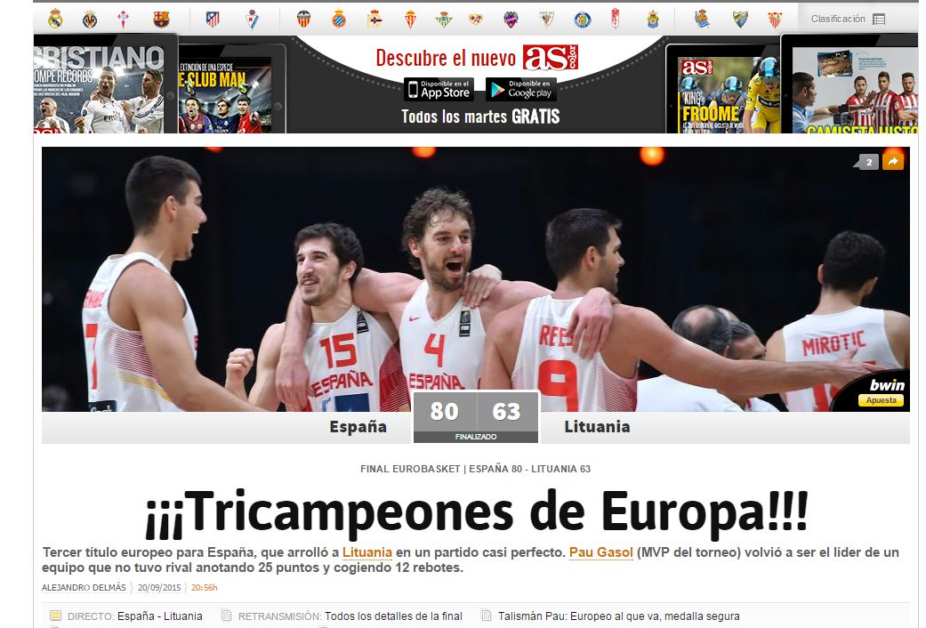 Σύσσωμος ο ισπανικός Τύπος αποθεώνει την πρωταθλήτρια Ευρώπης. Βαθιά υπόκλιση για τον Πάου Γκασόλ και τους συμπαίκτες του .