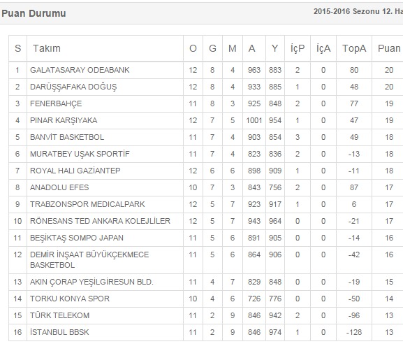 Το πρόγραμμα της 12ης αγωνιστικής: Μπελεντίγε-Άνκαρα 74-72, Τουρκ Τέλεκομ-Νταρουσάφακα 72-82, Τράμπζονσπορ-Ουσάκ Σπορτίφ 98-66, Γεσιλγκίρεσουν-Γκαζιάντεπσπορ 78-65, Μπουγιουκτσεκμετζέ-Μπάνβιτ 78-65, Μπουγιουκτσεκμετζέ-Μπάνβιτ 74-67, Καρσίγιακα-Γαλατάσαραϊ 97-92, Μπεσίκτας-Σελτσούκ. Αναντολού Εφές-Φενέρμπαχτσε