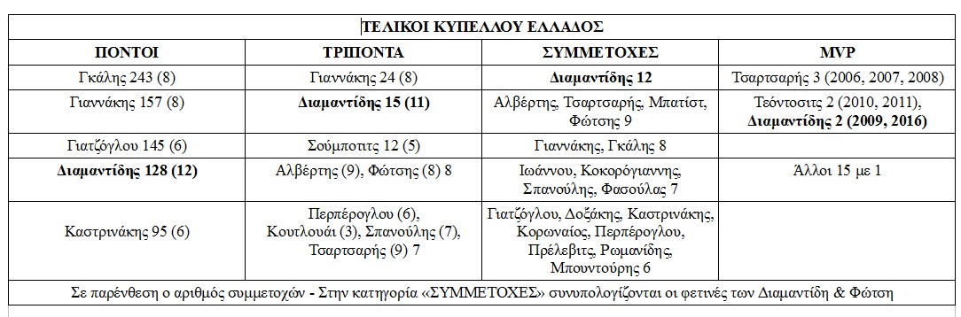 Απόψε, έγραψε ακόμα μία «χρυσή» σελίδα και στην 12η συμμετοχή του στο Κύπελλο Ελλάδος, αναδείχθηκε για 2η φορά MVP του τελικού κι ολοκλήρωσε την πορεία του στον θεσμό ως τέταρτος σκόρερ (128) πίσω από τους Γκάλη, Γιαννάκη και Γιατζόγλου. Μάλιστα, είναι δεύτερος στα τρίποντα με 15 εύστοχα πίσω από τον Γιαννάκη και πρώτος σε συμμετοχές με διαφορά!