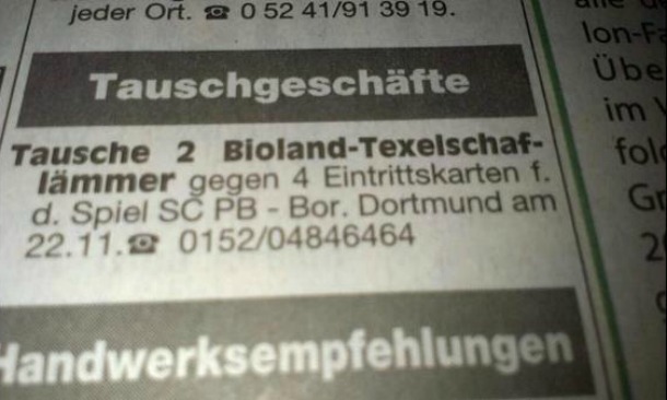 Τα εισιτήρια για οποιοδήποτε ματς της Bundesliga είναι ούτως ή άλλως είδος προς... εξαφάνιση. Πόσο μάλλον, όταν μιλάμε για το μικρότερο στάδιο στην κατηγορία, την Benteler Arena. Με χωρητικότητα μόλις 15.300 θεατών και την Πάντερμπορν να κάνει εξαιρετική πορεία, όλοι θέλουν να παρακολουθήσουν το ματς με την Ντόρτμουντ. Έτσι, ένας οπαδός κατέφυγε στην τελευταία λύση, προκειμένου να βρει ένα από τα τελευταία μαγικά χαρτάκια. Έβαλε αγγελία σε εφημερίδα και προσφέρει δύο από τα... πρόβατά του σε όποιον του προσφέρει 4 εισιτήρια!