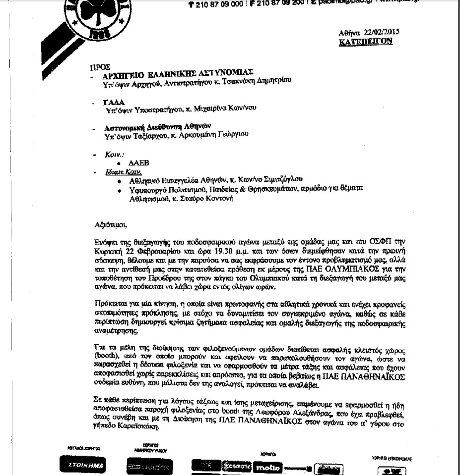 Αυτό ήταν η επιστολή των «πράσινων» προς το Αρχηγείο της Ελληνικής Αστυνομίας, στη ΓΑΔΑ, την Αστυνομική Διεύθυνση Αθηνών που κοινοποιήθηκε στον Αθλητικό Εισαγγελέα Αθηνών, Κων/νο Σιμιτζόγλου και τον Υφυπουργό, Σταύρο Κοντονή και μέσω της οποίας οι ζητούσαν να γίνει το ματς χωρίς θεατές, αν ο Βαγγέλης Μαρινάκης καθόταν στον πάγκο του Ολυμπιακού και όχι στο προβλεπόμενο μπουθ.