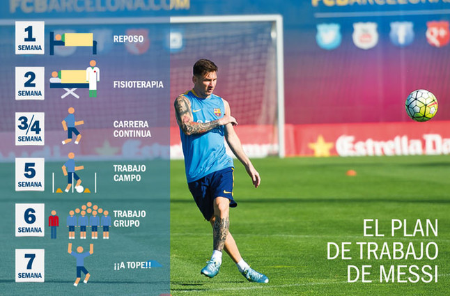 Αν όλα πάνε σύμφωνα με το πρόγραμμα, ο Μέσι θα αρχίσει να κλωτσάει μπάλα από την πέμπτη εβδομάδα. Οι γιατροί τονίζουν πως ιατρικώς δεν είναι σοβαρός ο τραυματισμός, αλλά πολλά εξαρτώνται από την ψυχολογία του παίκτη και από το αν φοβηθεί να μπει σε ρυθμό! Οι γιατροί ευελπιστούν πως στην έκτη εβδομάδα ο Μέσι θα κάνει προπονήσεις με την υπόλοιπη ομάδα και μια εβδομάδα αργότερα θα είναι σε θέση να τεθεί στα πλάνα του Λουίς Ενρίκε. Αλλωστε, αυτός ο τραυματισμός είναι συνηθισμένος και οι γιατροί γνωρίζουν ακριβώς τον χρόνο αποθεραπείας. Φυσικά ο Μέσι δεν θα ταξιδέψει στην πατρίδα του για τα φιλικά της Εθνικής του. Σημαντικό ρόλο θα παίξει ο φυσιοθεραπευτής της Εθνικής της χώρας του, Λουίς Γκαρσία, ο οποίος τις επόμενες ημέρες θα βρίσκεται στη Βαρκελώνη, έτσι ώστε να βοηθήσει όσο χρειαστεί!