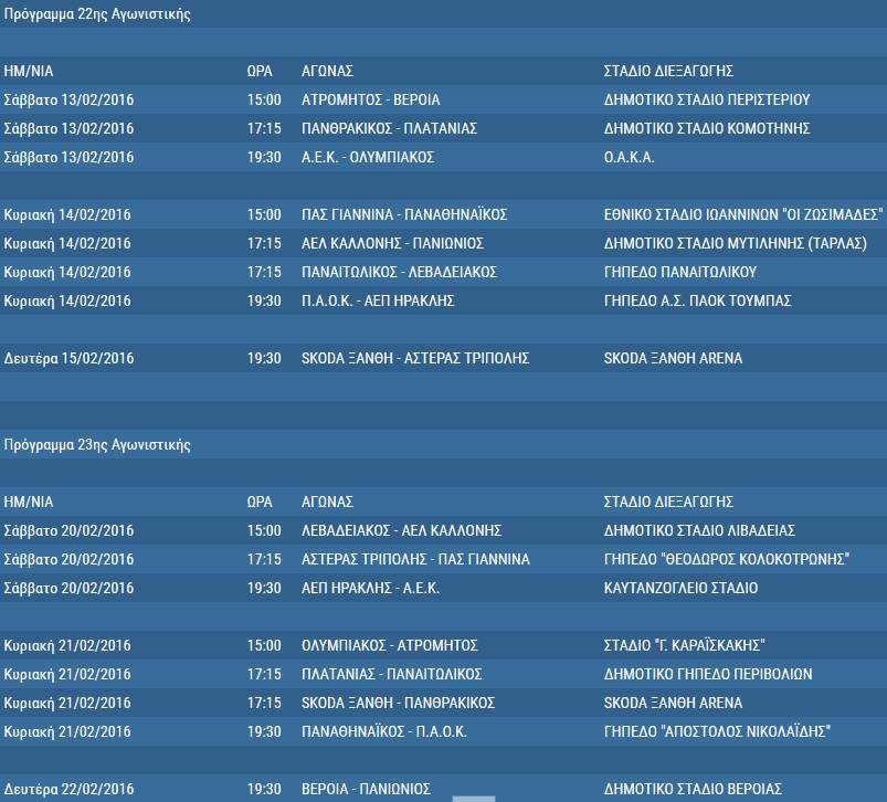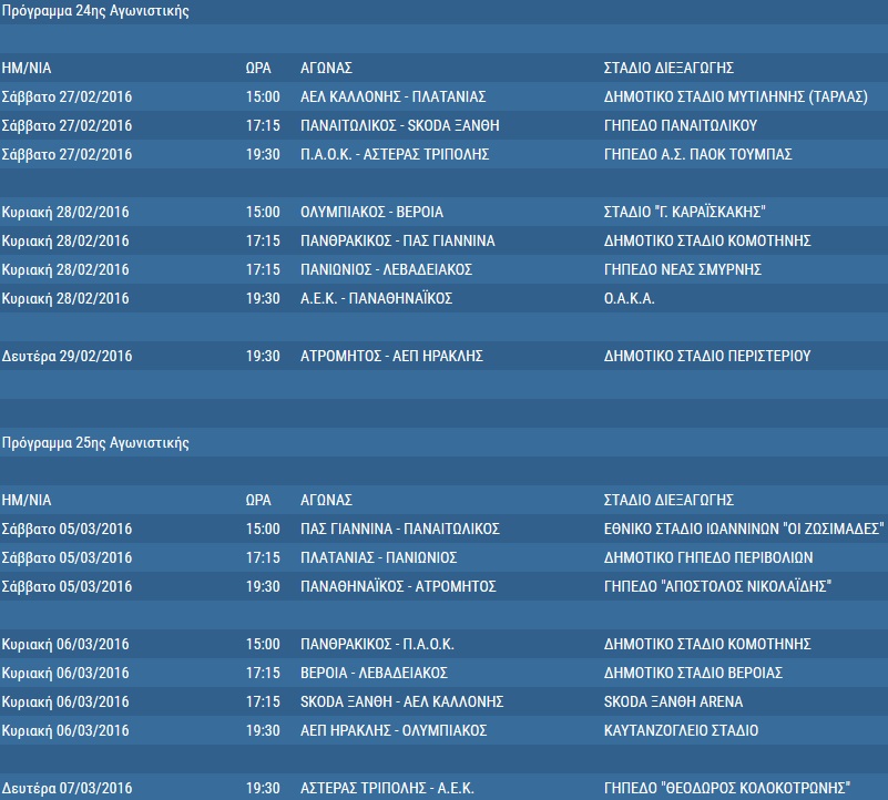 Όσον αφορά τα ντέρμπι, αυτό των «αιωνίων» προγραμματίστηκε για την Κυριακή 13 Μαρτίου στις 19:30, ενώ στις 7 Φεβρουαρίου ο Ολυμπιακός θα υποδεχθεί τον ΠΑΟΚ, με τους Πειραιώτες να αντιμετωπίζουν την ΑΕΚ στο ΟΑΚΑ στις 13 του ίδιου μήνα.