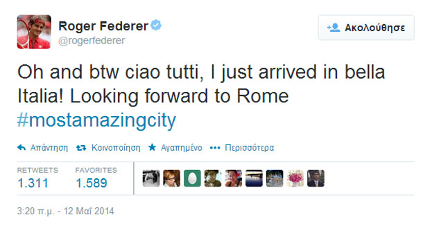 "Ciao tutti", έγραψε στον λογαριασμό του στο twitter o βασιλιάς και σκόρπισε χαμόγελα στους φαν του. "Μόλις έφτασα στην όμορφη Ιταλία. Ανυπομονώ για τη Ρώμη". Θυμίζουμε ότι ο Ρότζερ δεν πήρε μέρος στο Masters της Μαδρίτης και όλοι περίμεναν ότι η επιστροφή του θα γινόταν στο Ρολάν Γκαρός. Να, λοιπόν, που έκανε την έκπληξη και θα προσπαθήσει να φτάσει ένα βήμα πιο μακριά από πέρυσι, δηλαδή να κατακτήσει τον τίτλο για πρώτη φορά στην καριέρα του.