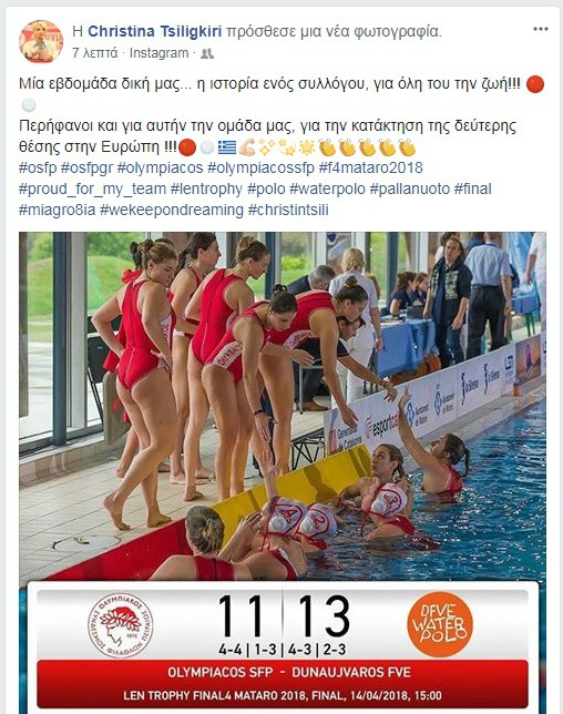 Η Χριστίνα Τσιλιγκίρη με ποστάρισμά της δεν έκρυψε την υπερηφάνειά της και για την γυναικεία ομάδα πόλο του Ολυμπιακού μετά την παρουσία της σε έναν ακόμα ευρωπαϊκό τελικό.