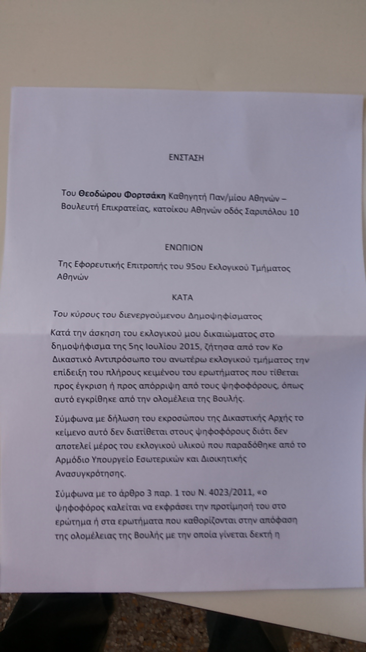 Ο βουλευτής της ΝΔ Θεόδωρος Φορτσάκης κατέθεσε ένσταση γιατί στο εκλογικό τμήμα δεν υπήρχε το πλήρες κείμενο του ερωτήματος που τίθεται προς έγκριση ή απόρριψη από τους ψηφοφόρους.