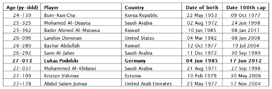 Ο αριστεροπόδαρος επιθετικός, που άφησε την Κολονία για την Αρσεναλ, λίγες μέρες αφού έκλεισε τα 27 του χρόνια συμπληρώνει στον αγώνα με τη Δανία 100 εμφανίσεις με το Εθνόσημο στο στήθος και γίνεται ο νεότερος Ευρωπαίος που το καταφέρνει. Παρά το δύσκολο επίτευγμα, πέρα από τον «Πόλντι» σε όλο τον κόσμο υπάρχουν έξι νεότεροι παίκτες που έχουν κάνει κάτι ανάλογο σε μικρή ηλικία, όμως είναι εκτός Ευρώπης. Δείτε τα όλα αναλυτικά στον πίνακα.