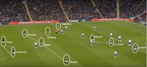 Η ιδέα του Σαμπάολι είναι το ένα τουλάχιστον μπακ να παραμένει πάντα ψηλά στο επιθετικό τρίτο της Αργεντινής η οποία ταυτόχρονα θα φέρει σύγκλιση προς τα μέσα σε πιο ελεύθερο ρόλο των τριών που θα αποτελούν την γραμμή πίσω από τους Μέσι κι έναν εκ των Ιγουαΐν και Αγουέρο. Με τον τρόπο αυτό θα προσπαθήσει να δημιουργήσει κενούς χώρους τους οποίους τα μπακ θα προσπαθήσουν να τα εκμεταλλευτούν. Και στο Μάντσεστερ το πλάνο δούλεψε καλά με το αριστερό μπακ-χαφ Ταλιαφίκο να φτάνει κοντά στο να σκοράρει με τον Μπουφόν να του λέει όχι.
