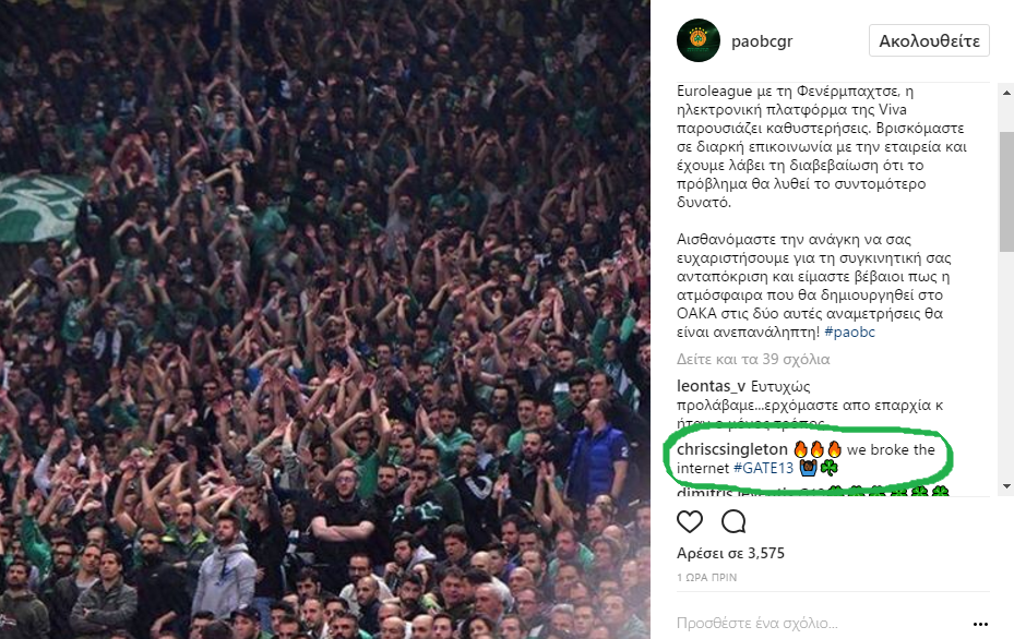 «We broke the internet #GATE13» έγραψε χαρακτηριστικά στο Instagram και κάτω από την ανάρτηση της «πράσινης» ΚΑΕ για την εξήγηση του... κολλήματος που παρουσιάστηκε με τη διάθεση των εισιτηρίων!