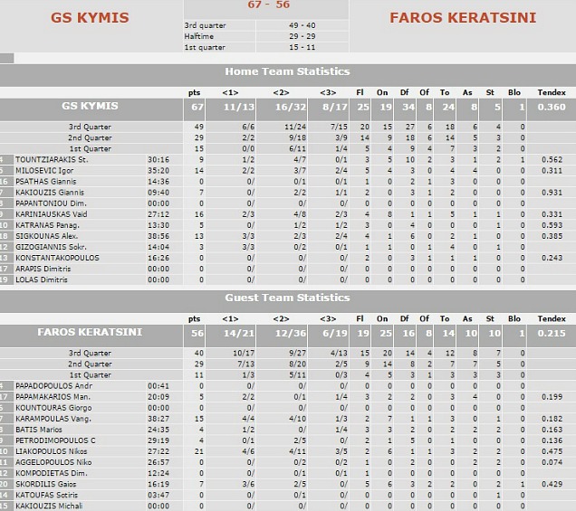 Κύμη (Μπρατσιάκος): Τουντζιαράκης 9 (12ρ.), Μιλόσεβιτς 14 (2), Ψαθάς, Κακιούζης 7 (1), Καρινιάουσκας 16 (2), Κατράνας 5 (1), Σιγκούνας 13 (2), Γκιζόγιαννης 3, Κωνσταντακόπουλος