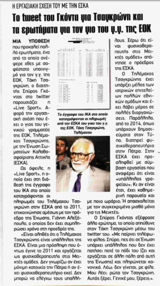 Η εφημερίδα έχει στην διάθεσή της έγγραφο του ΙΚΑ, στο οποίο καταγράφονται οι πληρωμές του Τηλέμαχου Τσαγκρώνη στην ΕΣΚΑ από το 2011, ενώ σε επικοινωνία που είχε με τον πρόεδρο της Ένωσης, Γιάννη Αλεξόπουλο, εκείνος απάντησε: «Είναι αληθές ότι ο Τηλέμαχος Τσαγκρώνης είναι υπάλληλος της ΕΣΚΑ. Είναι μια πρόσληψη που έγινε το 2011 κι εργάζεται ως φυσιοθεραπευτής στις Μεικτές Ομάδες. Δεν γνωρίζω αν έχει μόνιμη κατοικά την Πάτρα ή αν έχει φυσικοθεραπευτήριο εκεί. Δεν μπορώ να ελέγχω τους υπαλλήλους».