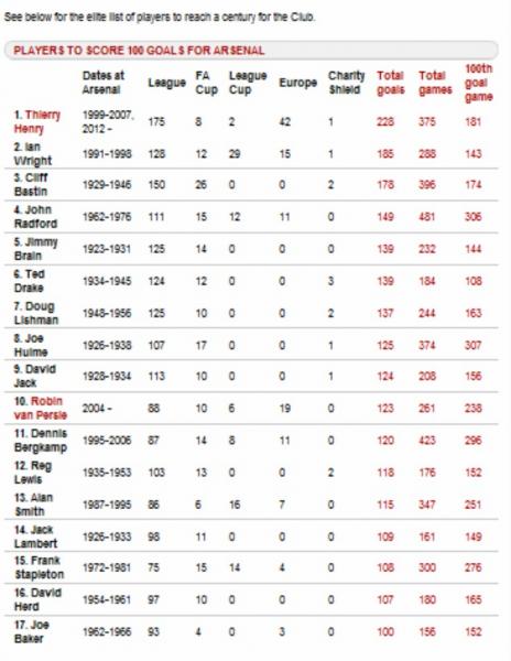 Ο Φαν Πέρσι σκόραρε 3 φορές στο παιχνίδι με την Μπλάκμπερν (έβγαλε και 2 ασίστ), έφτασε τα 22 γκολ σε 24 αγώνες στη φετινή σεζόν και έγραψε ιστορία. Ο Ολλανδός έχει πλέον 123 γκολ σε 261 εμφανίσεις με την φανέλα της Άσρεναλ (σε όλες τις διοργανώσεις) και ξεπέρασε τον Ντένις Μπέργκαμπ, μπαίνοντας στο top 10 των σκόρερς των «κανονιέρηδων»! Επόμενος στόχος του 28χρονου Ολλανδού είναι, εκτός από το να ανέβει και άλλο στη λίστα, να φτάσει τα 100 γκολ στην Πρέμιερ Λιγκ, στην οποία μέχρι στιγμής έχει 88. Αν μη τι άλλο απόλυτα εφικτός στόχος...