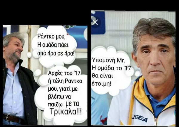 Συνόδευσε μάλιστα αυτό το σχόλιο με δύο φωτογραφίες που είχαν υποστεί μοντάζ για να προκύπτει διάλογος ανάμεσα στους εικονιζόμενους Γιάννη Κομπότη και Ράτκο Ντόστανιτς! “Ράτκο μου, η ομάδα πάει από 4άρα σε 4άρα”, έγραφε το πρώτο “συννεφάκι” από τον ισχυρό άνδρα της ΠΑΕ. “Υπομονή Mr. Η ομάδα το 2017 θα είναι έτοιμη”, εμφανιζόταν να αναφέρει στην... απολογία του ο Σέρβος τεχνικός, με την τελευταία κουβέντα όμως να ανήκει στον Κομπότη: “αρχές του 2017 ή τέλη, Ράτκο μου, γιατί με βλέπω να παίζω με τα Τρίκαλα”. Πάντως λίγο πριν το... κλείσιμο του 2016 ο Λεβαδειακός ανακοίνωσε Δ.Σ. στο οποίο ο Κομπότης δεν έχει καμία θέση πουθενά.