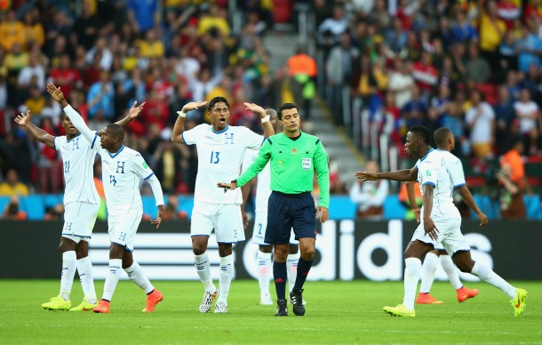 H PHOTO TOY AΓΩΝΑ: Οι παίκτες των Ονδούρων διαμαρτύρονται για το δεύτερο γκολ της Γαλλίας και το αν η μπάλα πέρασε την γραμμή. Ήταν η πρώτη φορά που η τεχνολογία γραμμής βοήθησε πραγματικά και φυσικά ο διαιτητής Ρίτσι δεν άκουγε κουβέντα...