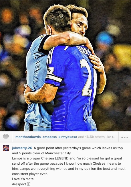 Ο Λάμπαρντ, αποθεώθηκε από τον κόσμο της Τσέλσι κι ας υπηρετεί πια τη Μάντσεστερ Σίτι, με τον Τζον Τέρι να «ανεβάζει» στο Instagram φωτογραφία τους με το παρακάτω μήνυμα: