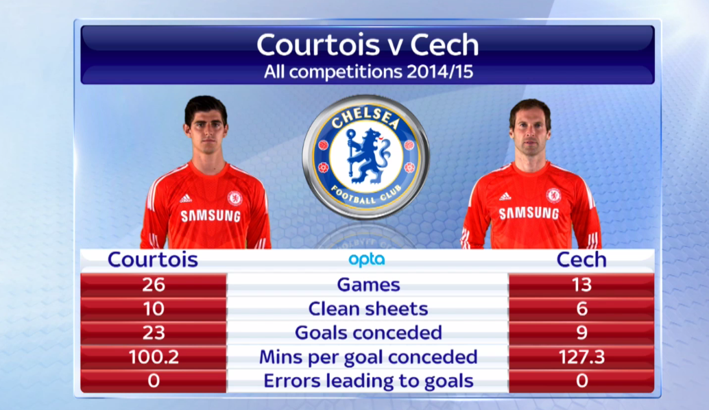 Ο Βέλγος ήταν εξ αρχής η πρώτη επιλογή του Πορτογάλου τεχνικού για τα γκολπόστ της Τσέλσι και εξακολουθεί να έχει προβάδισμα έναντι του έμπειρου Τσεχ. Ωστόσο, στα παιχνίδια που έχουν δώσει και οι δύο φέτος (7 περισσότερα ο Κουρτουά), ο 32χρονος γκολκίπερ έχει καλύτερα νούμερα από τον ανταγωνιστή του για τη θέση κάτω από τα δοκάρια.