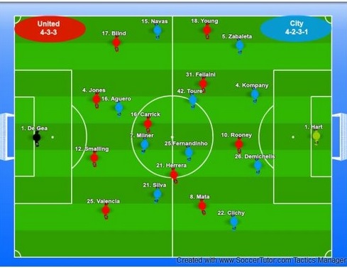 Manchester City: Η City από την μεριά της παρατάχθηκε με 4-4-1-1 που μετατρέπονταν συχνά σε 4-4-2 τόσο στην άμυνα όσο και στην επίθεση. Ο Milner μαζί με τον Aguero αναλάμβαναν να ξεκινούν την πίεση από ψηλά καθώς ο Pelegrini ήθελε να εμποδίσει την United να αναπτυχθεί από την άμυνα και με αυτόν τον τρόπο να πάρει τον έλεγχο και την κατοχή της μπάλας. Ο Toure τοποθετήθηκε κοντά στον Fellaini ενώ ο Fernandinho φρόντιζε να κινείται κοντά στον Herrera. O Clichy από τα αριστερά ακολουθούσε ακόμη και πολύ ψηλά τον Mata, ώστε να τον εμποδίζει να υποδέχεται χωρίς πίεση και να δημιουργεί αριθμητική υπεροχή στο κέντρο. Αυτή η προσέγγιση δημιούργησε αρκετά προβλήματα στην City, κυρίως στο δεύτερο ημίχρονο, καθώς ο Valencia εκμεταλλεύτηκε πολλές φορές τον διαθέσιμο χώρο στην πλάτη του Clichy. Ο Zabaleta από την άλλη έμενε κοντά στον Young που, όπως και ο Navas της City, έπαιζε πάνω στην πλάγια γραμμή. Όσον αφορά την επιθετική λειτουργία η ομάδα του Pelegrini επιδίωξε να εκμεταλλευτεί τον χρόνο με την μπάλα που είχε ο Silva στα αριστερά, καθώς ο Valencia δεν τον επιτηρούσε από κοντά. Αυτό είχε σαν αποτέλεσμα να μένει ο Ισπανός μερικά δευτερόλεπτα ελεύθερος, πριν κάποιος από τους Mata και Herrera αναλάβει το μαρκάρισμα του.