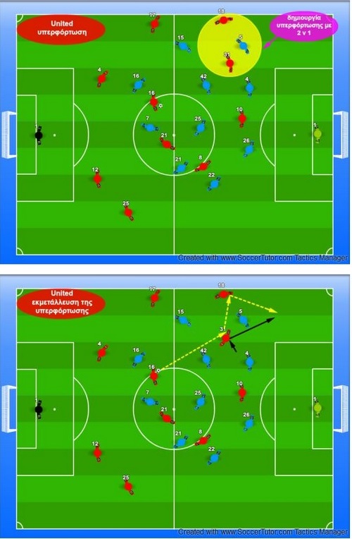 Στις περιπτώσεις δε που αυτό δεν ήταν εφικτό, η μεγάλη μεταβίβαση προς τον Fellaini δεν αποτελούσε πάσα με πιθανότητες 50/50 επιτυχίας αλλά 80/20 για την United, καθώς ο Βέλγος δεν είχε αντίπαλο στο αέρα. Στην συνέχεια η μπάλα κατέβαινε στο έδαφος και κυκλοφορούσε μέσω των Carrick και Herrera που παρείχαν άμεσα στηρίγματα. Το 2ο γκολ προήλθε από μακρινή διαγώνια μεταβίβαση προς τον Young και εκμετάλλευση της ικανότητας του Fellaini στον ψηλό παιχνίδι και ενώ η United είχε αναλάβει το πάνω χέρι στην αναμέτρηση.