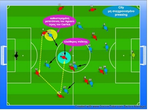 Πολλές φορές τόσο ο Aguero όσο και ο Milner είχαν πολύ προωθημένες θέσεις και δημιουργούσαν κατάσταση 2 ν 2 στο κέντρο της άμυνας της United. Για να αντιμετωπιστεί η ισαριθμία στο κέντρο της άμυνας, ο Valencia απέφευγε να ακολουθεί τις κινήσεις του Silva χαμηλά στο γήπεδο, και παρέμενε κοντά στους δύο κ. αμυντικούς ώστε να υπάρχει κατάσταση 3 ν 2.