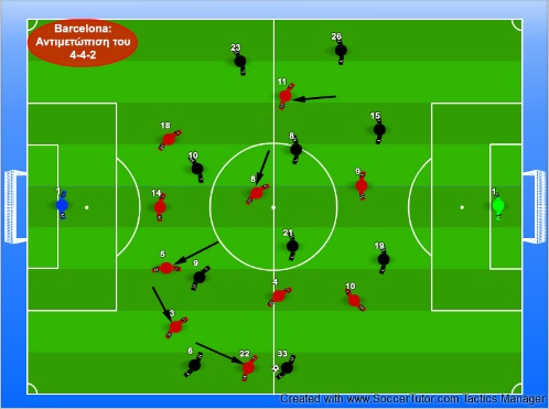 Στην περίπτωση που και οι δύο αντίπαλοι πλάγιοι μέσοι βρίσκονται ψηλά, ο αμυντικός μέσος της Barca θα κατεβαίνει χαμηλά κοντά στους κεντρικούς αμυντικούς δημιουργώντας κατάσταση 5 ν 4.