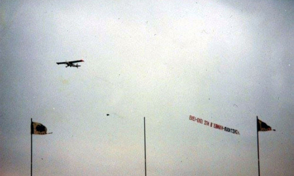 Ο Μάρτης του 1997 «σημαδεύεται» από το αεροπλανάκι της εφημερίδας «ΠΑΟΚΤΣΗΣ» (κυκλοφόρησε από το 1995 έως το 2000), που πέταξε κατά τη διάρκεια του ντέρμπι με τον Άρη πάνω από τον ουρανό της Τούμπας, με το μήνυμα «Εκεί, εκεί στη Β’ Εθνική»! Η κορυφαία, αν μη τι άλλο, εμπνευσμένη ποδοσφαιρική καζούρα που σημειώθηκε σε ελληνικό γήπεδο.