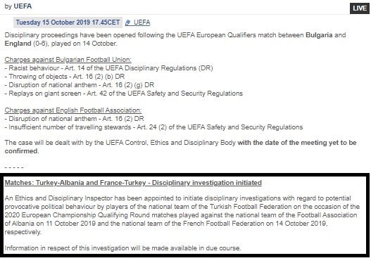 Προφανώς το θέμα είναι σοβαρότατο για την UEFA και το πως θα χειριστεί την υπόθεση και γι' αυτόν ακριβώς τον λόγο δεν κάλεσε σε απολογία την Τουρκία με συγκεκριμένα άρθρα (όπως έκανε για παράδειγμα με την Βουλγαρία και την Αγγλία).