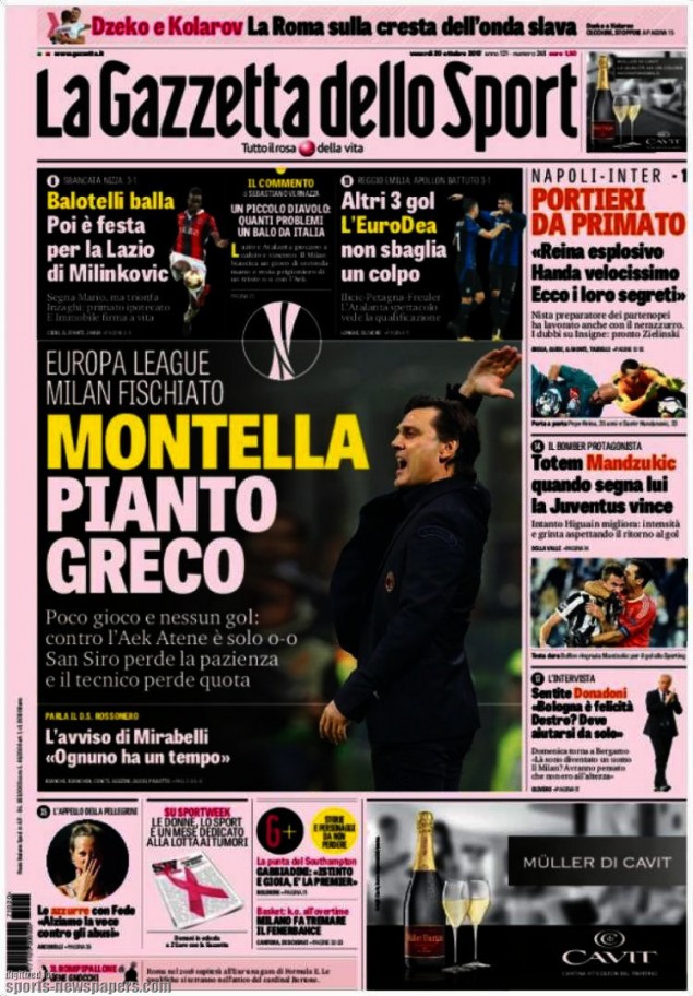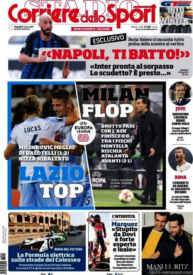 Από την πλευρά της η Corriere dello sport μοιράζεται το πρωτοσέλιδο με τις Λάτσιο και Μίλαν και κάνει λογοπαίγνιο με τα εκ διαμέτρου αντίθετα αποτελέσματα των δύο ομάδων στο Europa League. «Λάτσιο top και Μίλαν flop» είναι ο τίτλος και προσθέτει για τους Μιλανέζους: «άσχημο 0-0»!