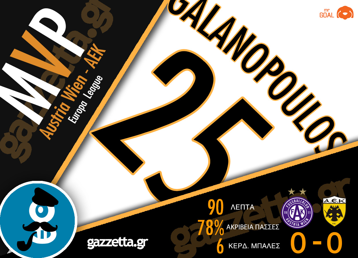 Mvp: Γαλανόπουλος. Ο νεαρός μέσος έπαιξε για 90 λεπτά και ήταν παντού. Εκανε μόνο ένα λάθος στο πρώτο ημίχρονο αλλά ανούσιο στον χώρο του κέντρου. Μαζί με τον Σιμόες ήταν οι καλύτεροι της ΑΕΚ.