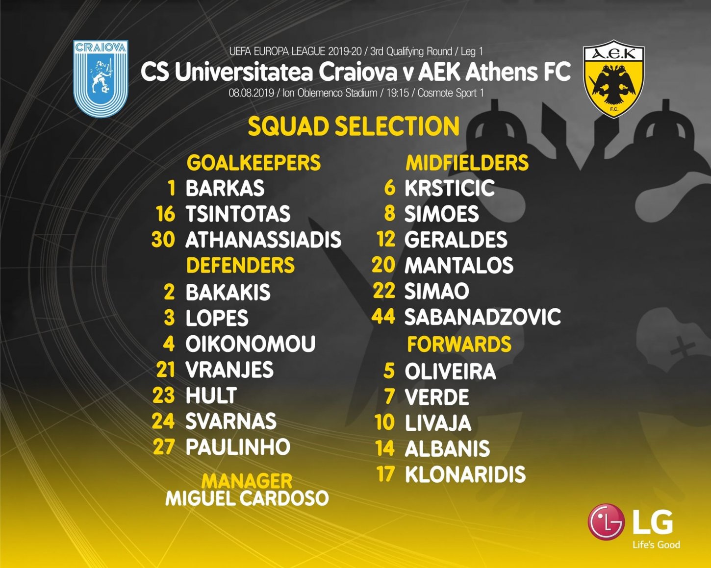 Ο Νέναντ Κρίστιτσιτς αρχικά δεν είχε δηλωθεί στην ευρωπαϊκή λίστα της ΑΕΚ για τα ματς με την Κραϊόβα λόγω του προβλήματος τραυματισμού που αντιμετώπιζε. Ωστόσο, ο Μιγκέλ Καρντόσο είχε τη δυνατότητα για αλλαγές μέχρι την Τετάρτη.