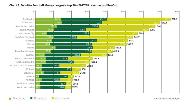 Η Ρεάλ Μαδρίτης (συνολικά έσοδα 750,9 εκατομμυρίων ευρώ), η Μπαρτσελόνα (690,4 εκατομμύρια ευρώ) και η Μάντσεστερ Γιουνάιτεντ (666 εκατομμύρια ευρώ), αποτέλεσαν (είναι) τους τρεις πλουσιότερους συλλόγους σύμφωνα με την έκθεση της Deloitte, καταγράφοντας συνολικά έσοδα 2,1 δισεκατομμύρια ευρώ, ποσό μεγαλύτερο από το διπλάσιο των συνολικών εισοδημάτων των τριών αυτών ομάδων 10 χρόνια πριν (περίοδος 2007/2008). Αξίζει να σημειωθεί πως για να εξασφαλίσει κάποιος μία θέση στην εικοσάδα αυτής της χρονιάς απαιτούνταν έσοδα ύψους τουλάχιστον 200 εκατομμυρίων ευρώ.