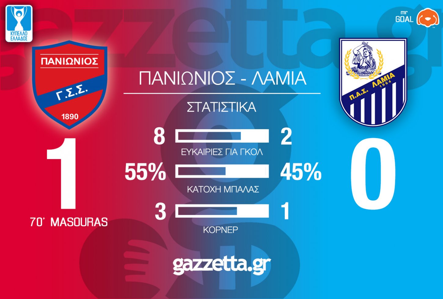 Οι Σιώπης-Βλάχος-Μασούρας... εξαφάνισαν τη μπάλα, ο τελευταίος την εμφάνισε στα δίχτυα της Λαμίας και με το 1-0 ο Πανιώνιος έχει τον πρώτο λόγο, ενόψει της ρεβάνς, για πρόκριση στους «4» του Κυπέλλου Ελλάδος!