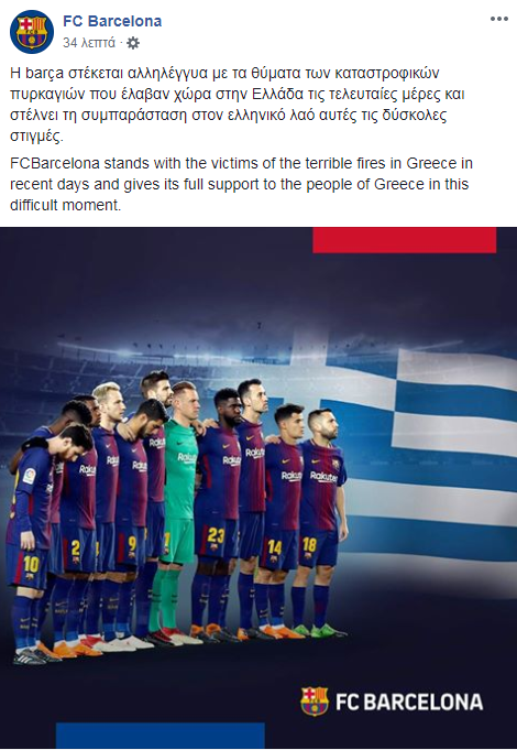 Πόνος, θλίψη, εικόνες που σοκάρουν και ο εφιάλτης δεν έχει τελειωμό... Η τραγωδία στο Μάτι άφησε πίσω της δεκάδες νεκρούς και τραυματίες, καμμένη γη και μια ολοκληρωτική περιβαλλοντική καταστροφή. Η Ελλάδα πονά και μαζί της δεκάδες χώρες που στέλνουν μηνύματα συμπαράστασης. Ο πόνος εξαπλώθηκε εκτός συνόρων και στο πλευρό μας και αρκετές προσωπικότητες της τέχνης και του αθλητισμού, ενώ σύλλογοι δεν ξεχνούν τον εφιάλτη μας. Ανάμεσά τους και η Μπαρτσελόνα, η οποία στον επίσημο λογαριασμό της στο facebook συνεχίζει κι αυτή την αλυσίδα αγάπης που σχηματίζεται «Η Μπαρτσελόνα στέκεται αλληλέγγυα με τα θύματα των καταστροφικών πυρκαγιών που έλαβαν χώρα στην Ελλάδα τις τελευταίες μέρες και στέλνει τη συμπαράσταση στον ελληνικό λαό αυτές τις δύσκολες στιγμές» ήταν το υπέροχο μήνυμά της.