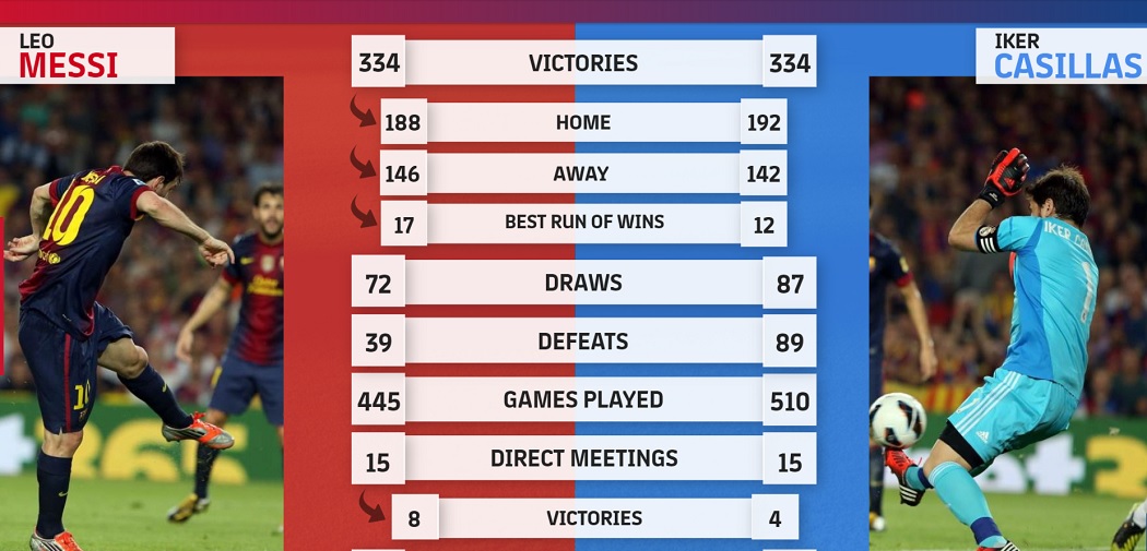 Το καλύτερο σερί νικών που έχει επιδείξει ο Μέσι σε αυτές τις 334 είναι τα 17 διαδοχικά «τρίποντα» έναντι των 12 που είχε ο «άγιος Ίκερ», ο οποίος υπερέχει μονάχα στις εντός έδρας νίκες έναντι του ηγέτη των Καταλανών.