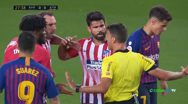 Κλασικός Ντιέγκο Κόστα. Ο επιθετικός της Ατλέτικο Μαδρίτης αποβλήθηκε στο ματς με την Μπαρτσελόνα γιατί στο 28' έβρισε τον διαιτητή της αναμέτρησης, Χιλ Μανθάνο. Ο ρέφερι, ο οποίος είχε σφυρίξει και το ΠΑΟΚ-Ολυμπιακός για την Super League, κατέγραψε στο φύλλο αγώνα όλες τις βρισιές που πρόλαβε να του κατεβάσει ο Ντιέγκο Κόστα.