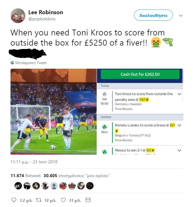 Ένας τύπος είχε κάνει τρία πονταρίσματα με 5 λίρες στους τρεις χθεσινούς αγώνες του Μουντιάλ. Το Μεξικό να επικρατήσει με 2-1 της Νοτίου Κορέας, τον Ρομέλου Λουκάκου να σκοράρει δύο γκολ στο παιχνίδι του Βελγίου με την Τυνησία και τον Τόνι Κροος να σκοράρει έξω από την περιοχή στο ματς της Γερμανίας με τη Σουηδία.