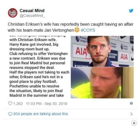 Πρόσφατα, κυκλοφόρησε πολύ κακή φήμη που ήθελε τον Βερτόνχεν να έχει κάνει κάτι με τη σύζυγο του Έρικσεν και μάλιστα να αιτιολογείται στο ερωτικό σκάνδαλο το μαυρισμένο μάτι του Βέλγου στόπερ, ο οποίος όμως είχε δεχθεί χτύπημα κατά τη διάρκεια μιας προπόνησης.