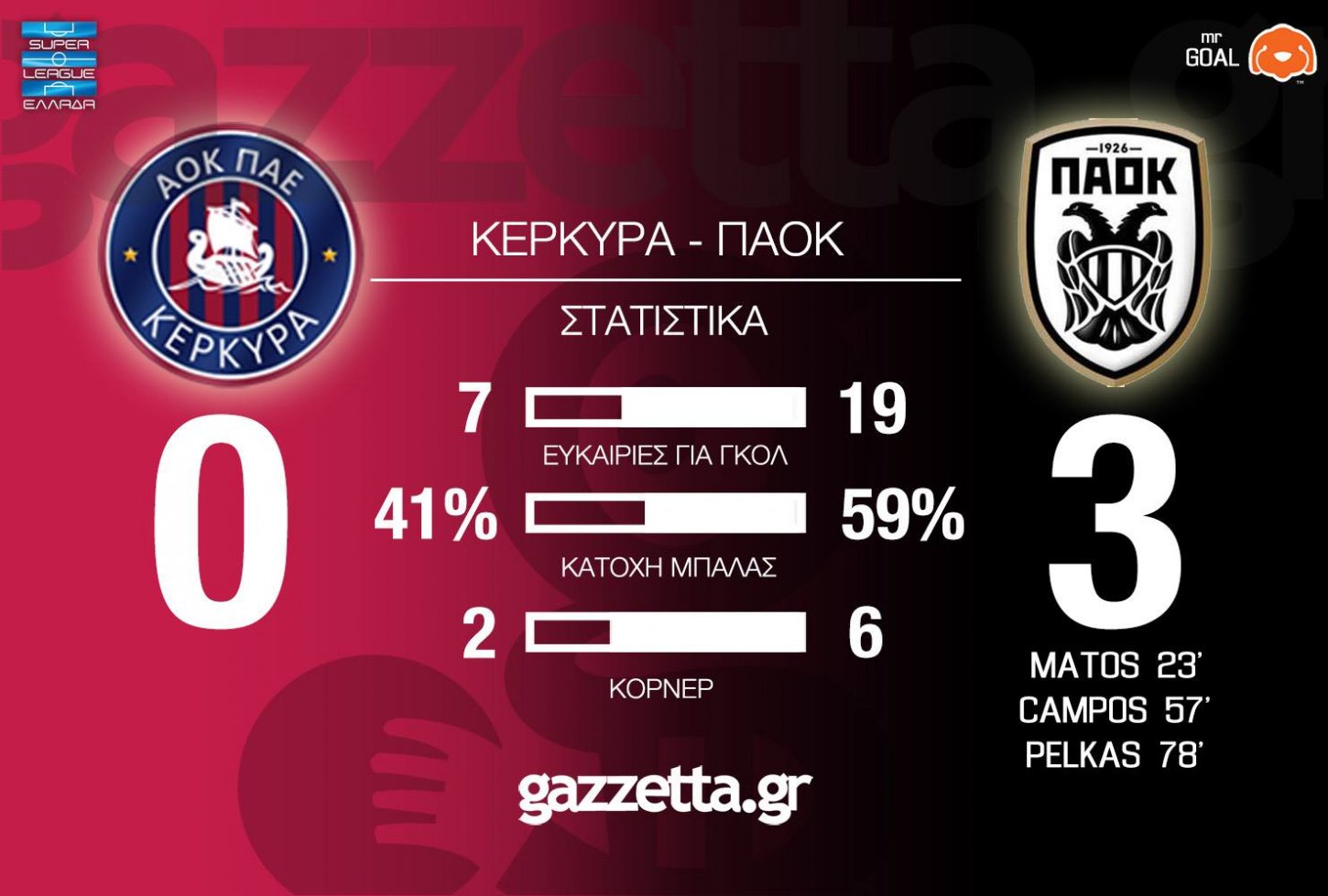 Ο Δημήτρης Πέλκας στο 78’, από την μπαλιά του Μακ, αν και γλίστρησε, κατόρθωσε να κάνει το 3-0 για τους «ασπρόμαυρους», η νίκη «κλείδωσε» γι’ αυτούς, με την Κέρκυρα μετά και την είσοδο του ποιοτικού Τουράμ να ψάχνει το γκολ της τιμής, αλλά τον ΠΑΟΚ στο 90’ να αγγίζει το τέταρτο γκολ με την απευθείας εκτέλεση φάουλ του Μαουρίσιο, που έστειλε την μπάλα στο δοκάρι της εστίας του Κουτζαβασίλη.