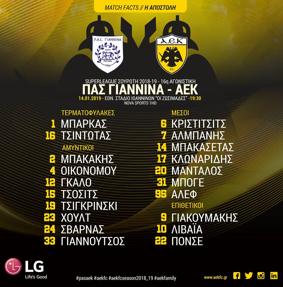 Αναλυτικά η αποστολή της ΑΕΚ για τα Γιάννενα: Μπάρκας, Τσιντώτας, Μπακάκης, Οικονόμου, Γκάλο, Τσόσιτς, Τσιγκρίνσκι, Χουλτ, Σβάρνας, Γιαννούτσος, Κρίστιτσιτς, Αλμπάνης, Κλωναρίδης, Μάνταλος, Άλεφ, Γιακουμάκης, Λιβάια, Μπακασέτας, Πόνσε και Μπογέ.