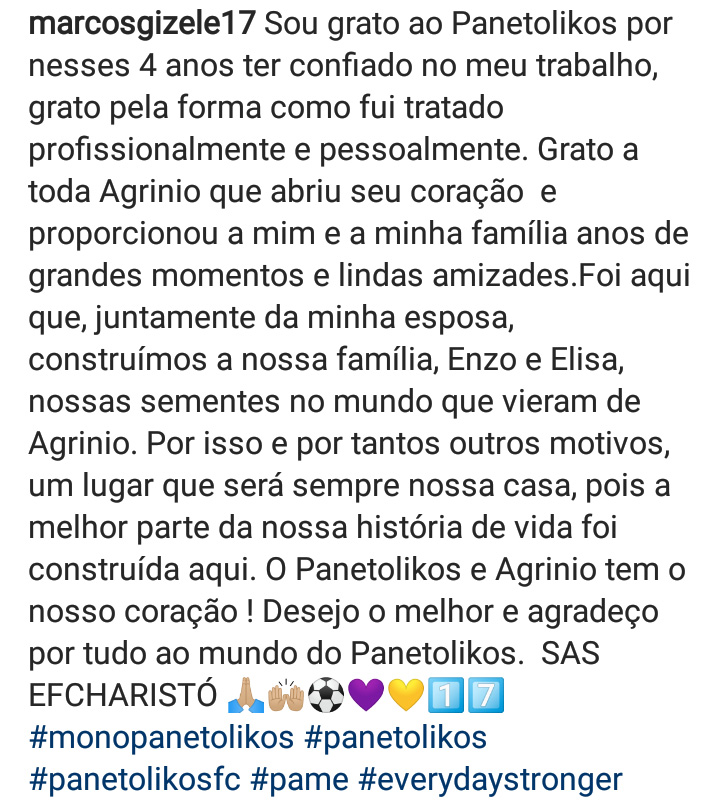 Είμαι ευγνώμων στον Παναιτωλικό για αυτά τα 4 χρόνια που έχει εμπιστευτεί το έργο μου, ευγνώμων για τον τρόπο που μου φέρθηκαν επαγγελματικά και ευγνώμων σε όλο το Αγρίνιο που άνοιξε την καρδιά του και παρείχε σε εμένα και την οικογένεια μου χρόνια μεγάλων στιγμών και όμορφες φιλίες. Εδώ είναι που, μαζί με τη γυναίκα μου, χτίσαμε την οικογένεια μας, τον Ένζο και την Ελίζα. Οι σπόροι μας στον κόσμο που ήρθαν από το Αγρίνιο. Γι’ αυτό και πολλούς ακόμα λόγους, είναι ένα μέρος που θα είναι πάντα το σπίτι μας, γιατί το καλύτερο μέρος της ιστορίας της ζωής μας χτίστηκε εδώ. Ο Παναιτωλικός και το Αγρίνιο έχουν θέση στην καρδιά μας! Εύχομαι τα καλύτερα και σας ευχαριστώ για όλα. Σας ευχαριστώ», έγραψε στο Instagram.