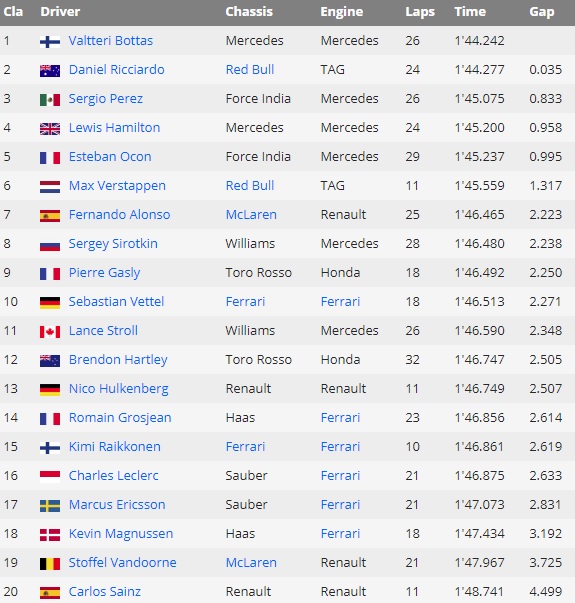 Σκληρή μονομαχία για τον καλύτερο χρόνο των πρώτων ελεύθερων δοκιμαστικών είχε ο Βαλτέρι Μπότας, με τον Ντάνιελ Ρικιάρντο. Μόλις 0,035 δευτερόλεπτα τους χώρισαν και φάνηκε, πως αμφότεροι βρίσκονται σε εξαιρετική φόρμα. Η άλλη Red Bull ωστόσο, αυτή του Φερστάπεν, δεν είχε ανάλογα καλή πορεία.