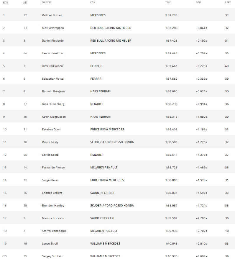 Πολύ γρήγορος ο Βαλτέρι Μπότας στη δεύτερη περίοδο των ελεύθερων δοκιμαστικών, για το Γκραν Πρι του Άμπου Ντάμπι. Ο Φινλανδός ήταν πιο αργός από τις Red Bull όμως στο FP2 έκανε αντεπίθεση και πέρασε μπροστά τους, με τον Φερστάπεν και τον Ρικιάρντο να τον ακολουθούν για τη δεύτερη και τρίτη θέση, αντίστοιχα. Τέταρτος ο Λιούις Χάμιλτον και πέμπτος, ο Κίμι Ράικονεν, ενώ ο Σεμπάστιαν Φέτελ δεν κατάφερε κάτι καλύτερο από την έκτη θέση.