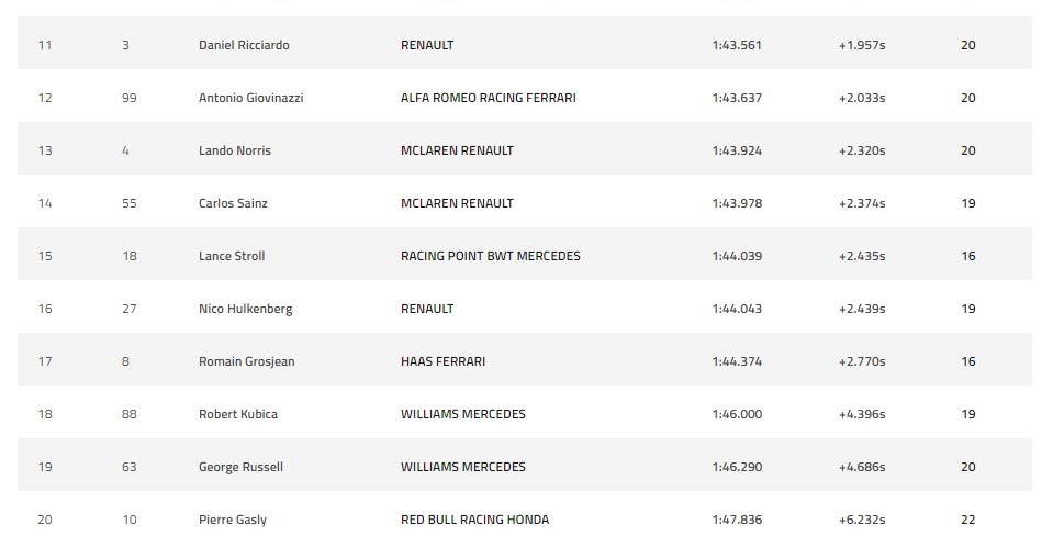 Στην έκτη θέση του FP3 στο Αζερμπαϊτζάν συναντάμε τον Ντανιίλ Κβίατ με Toro Rosso, με τον Κέβιν Μάγκνουσεν να ακολουθεί στην έβδομη θέση με Haas και την Toro Rosso του Άλεξ Αλμπόν στην όγδοη θέση. Να σημειωθεί ότι την πρώτη δεκάδα συμπληρώνουν η Racing Point του Σέρχιο Πέρεζ στην ένατη θέση και ο Κίμι Ράικονεν με Alfa Romeo στην δέκατη.