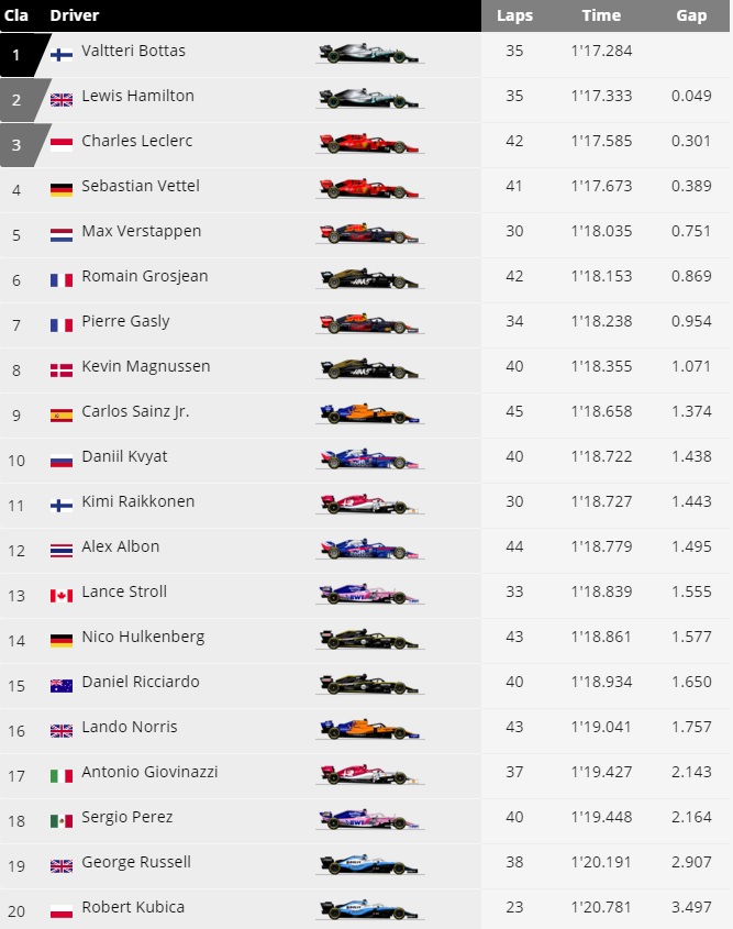Οριακά εκτός δεκάδας, στην ενδέκατη θέση, βρίσκεται ο Κίμι Ράικονεν που τελευταία στιγμή βελτίωσε το χρόνο του και ανέβηκε, από τη 15η θέση που ήταν πριν. Η δεύτερη περίοδος των ελεύθερων δοκιμαστικών ήταν πολύ «ήσυχη» και δεν είχαμε ευτράπελα. Μόνο ο Λανς Στρολ οδήγησε τη Racing Point του χωρίς το πιο πρόσφατο πακέτο αεροδυναμικής, αποτέλεσμα της σύγκρουσης που είχε το πρωί. Τα μέρη αυτά έσπασαν και η ομάδα του αναγκάστηκε να του δώσει το μονοθέσιο επισκευασμένο μεν, χωρίς αυτές τις αναβαθμίσεις δε.