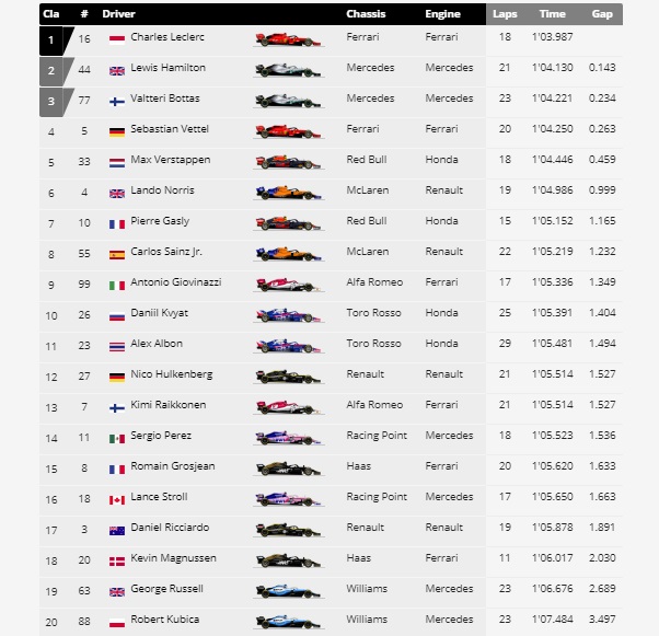 Το FP3 της Αυστρίας έφερε εκ νέου τον Σαρλ Λεκλέρκ στην κορυφή μετά το FP2, αφήνοντας πίσω τους Λιούις Χάμιλτον και Βάλτερι Μπότας, στην δεύτερη και τρίτη θέση αντίστοιχα. Τέταρτος ήταν ο Σεμπάστιαν Φέτελ με την έτερη Ferrari, ενώ την πρώτη πεντάδα συμπλήρωσε ο Μαξ Φερστάπεν με Red Bull.