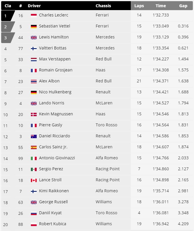 Καλά ξεκίνησε και το Σάββατο για τη Ferrari στη Ρωσία, αφού ο Σαρλ Λεκλέρ με τον Σεμπάστιαν Φέτελ έπιασαν τις πρώτες δύο θέσεις. Τα μονοθέσια της Ferrari έδειξαν πολύ γρήγορα και ικανά να διεκδικήσουν την pole position στις κατατακτήριες δοκιμές, αργότερα το Σάββατο! Ο Λιούις Χάμιλτον τους ακολούθησε στην τρίτη θέση, με τον Βαλτέρι Μπότας να βρίσκεται τέταρτος και ο Μαξ Φερστάπεν έκλεισε την πεντάδα.