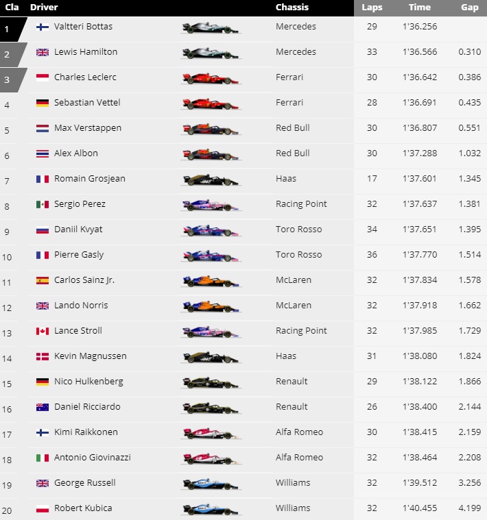 Τα δύο αυτοκίνητα κατευθύνθηκαν στα pits και η κόκκινη σημαία βγήκε για επτά λεπτά, μέχρι να καθαριστεί η πίστα. Μετά το δίδυμο της Mercedes στην κατάταξη, ακολούθησε ο Σαρλ Λεκλέρ. Τέταρτος ο Σεμπάστιαν Φέτελ και πέμπτος ο Μαξ Φερστάπεν, ενώ οι Άλμπον, Γκροζάν, Πέρεθ, Κβίατ και Γκασλί, έκλεισαν τη δεκάδα. Αναλυτικά τα αποτελέσματα παρακάτω!
