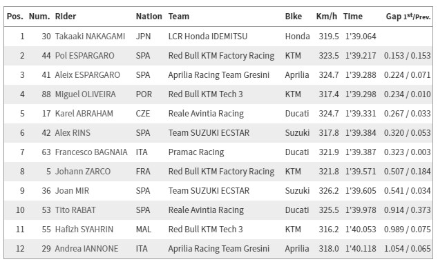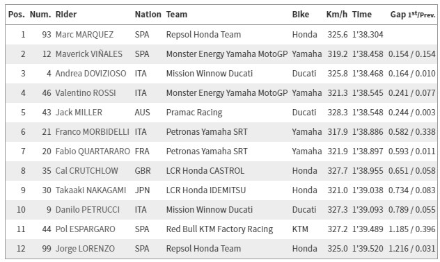 Για την ακρίβεια, σε κάποια φάση, Μάβερικ Βινιάλες και Βαλεντίνο Ρόσι πέρασαν το χρόνο του, όμως δευτερόλεπτα μετά ο Μάρκεθ ήρθε να βάλει τα πράγματα σε τάξη και πήρε πίσω την πρωτιά. Στη συνέχεια ο Αντρέα Ντοβιτσιόζο «χώρισε» τις δύο Yamaha και έτσι, μετά τον πρώτο Μάρκεθ, έχουμε τους Βινιάλες, Ντοβιτσιόζο και Ρόσι. Πέμπτος ο επίσης πολύ γρήγορος Τζακ Μίλερ, ενώ η σειρά του Q2 συμπληρώνεται από τους Μορμπιντέλι, Κουαρταράρο, Κράτσλοου, Νακαγκάμι, Πετρούτσι, Λορένθο και Πολ Εσπαργκαρό. Σε γενικές γραμμές οι κατατακτήριες δοκιμές πέρασαν χωρίς προβλήματα ή εκπλήξεις. Δείτε τα αποτελέσματα του Q2 και του Q1, αναλυτικά.
