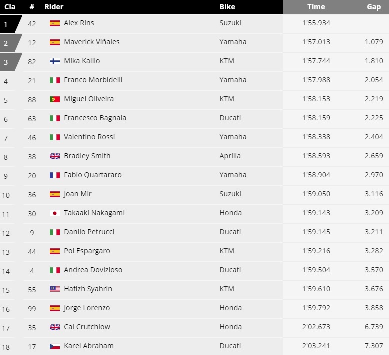 Μετά τον Ρινς, είχαμε τους Μάβερικ Βινιάλες και Μίκα Κάλιο με KTM, στην παρθενική του εμφάνιση αφού αντικαθιστά πλέον τον Ζαρκό και Μορμπιντέλι, Ολιβιέιρα, βρέθηκαν στην πεντάδα. Μπανάια, Ρόσι, Σμιθ, Κουαρταραρό και Μιρ, συμπληρώνουν τη δεκάδα της τρίτης περιόδου των ελεύθερων δοκιμαστικών. Παρακάτω, τα αποτελέσματα αναλυτικά: