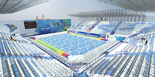 -Η διοργάνωση θα πραγματοποιηθεί σε 8 εγκαταστάσεις, από τις οποίες οι τέσσερις είναι βοηθητικές. Η Waterpolo Arena βρίσκεται στις όχθες του ποταμού Καζάνκα, μεταξύ του Καζάν Arena και Αquatics Palace. Πρόκειται για μία προσωρινή εγκατάστση, η οποία μετά το πέρας της διοργάνωσης θα πάψει να υφίσταται.